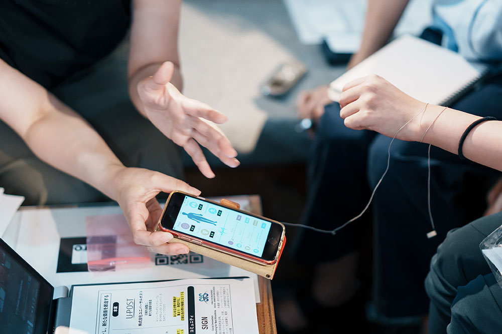 - 今田さん SNSでつながるのとは違う、身体的感覚や直感でつながりあう世界観を目指しています。デジタル技術はどんどん発展しますが、やっぱり五感が備わった人間本来の身体性を大事にしたいし、そこに新しい価値を見出したい。そのための触媒が「圧電組紐センサー」なんです。